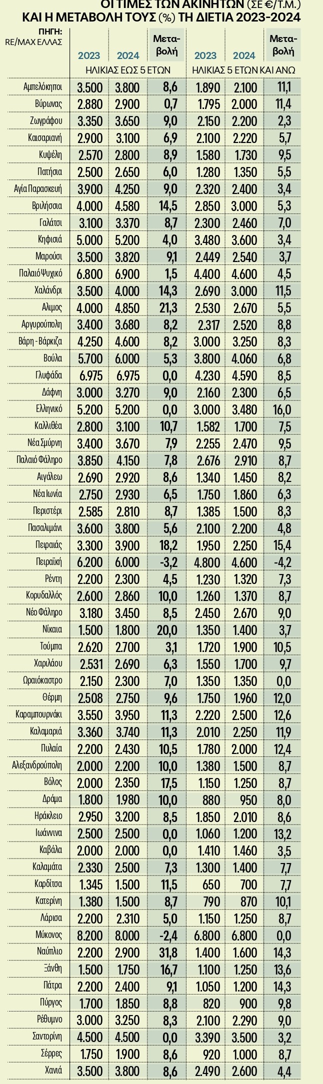 Χαρακτηριστικά παράδειγμα ότι σε 7 περιοχές της επικράτειας (Ναύπλιο, Αλιμο, Νίκαια, Ν. Μουδανιά, Πειραιά, Βόλο και Ξάνθη) οι αυξήσεις στις τιμές παλαιών ακινήτων ανήλθαν τη διετία 2023-2024 από 16,7% έως 31,8%!