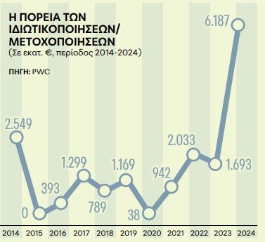 Επίσης τη 10ετία 2015-2014, σύμφωνα με τα στοιχεία της PWC, σωρευτικά οι εξαγορές και συγχωνεύσεις (Ε&Σ) στη χώρα μας ξεπέρασαν τα 52,1 δισ. ευρώ, ενώ οι ιδιωτικοποιήσεις/μετοχοποιήσεις τα 14,1 δισ. ευρώ αντίστοιχα.