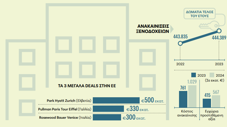 Μία από τις υψηλότερες τιμές πώλησης ανά δωμάτιο (price per key): 332.000 ευρώ, πολύ πάνω από χώρες όπως η Σουηδία και η Γερμανία.