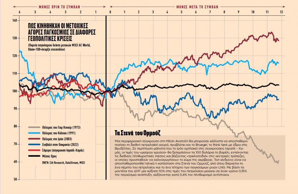 Οι επενδυτές θα πρέπει να εστιάσουν την προσοχή τους στον τομέα της ενέργειας, εκτίμησε η Citigroup. Ιστορικά, οι μετοχές κινούνται συνήθως υψηλότερα 12 μήνες μετά την έναρξη των γεωπολιτικών συγκρούσεων παρά στην αρχική αστάθεια αναφέρει, αλλά σημειώνουν σημαντική πτώση όταν οι γεωπολιτικοί κίνδυνοι οδηγούν σε ενεργειακές κρίσεις, όπως π.χ. κατά τον πόλεμο του Γιομ Κιπούρ τη 10ετία του 1970 και κατά την εισβολή της Ρωσίας στην Ουκρανία που εκτίναξε τις τιμές του αερίου.