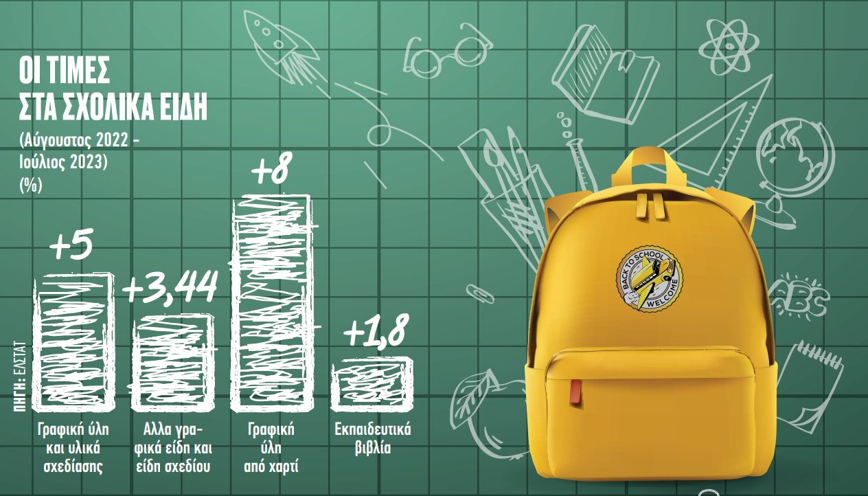 Μια οικογένεια με δύο παιδιά στις τελευταίες τάξεις του Δημοτικού θα πληρώσει κατά μέσο όρο από 180 έως 240 ευρώ για την αγορά όλης της γκάμας των απαραίτητων προϊόντων εν όψει της έναρξης της νέας σχολικής χρονιάς, όπως σχολική τσάντα, κασετίνα, απλά τετράδια και θεματικά, μπλοκ ζωγραφικής, φωτοτυπικό χαρτί, καλύμματα για τα βιβλία, μολύβια, ξυλομπογιές, μαρκαδόρους, γόμες, ξύστρες, διορθωτικά, είδη χειροτεχνίας και αρχειοθέτησης, είδη για το κολατσιό στο σχολείο, εκπαιδευτικά μουσικά όργανα κ.ά.