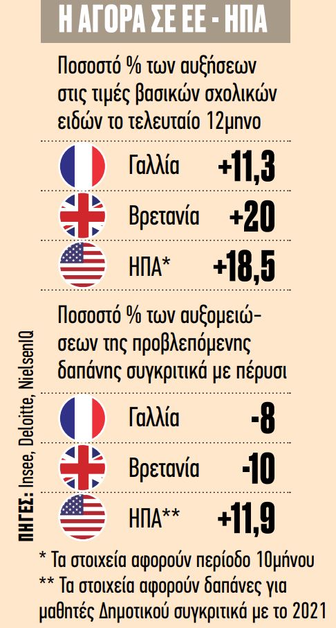 Η ακρίβεια στα σχολικά είδη είναι παγκόσμιο φαινόμενο. Και μάλιστα ξεπερνά κατά πολύ τα επίσημα ποσοστά του πληθωρισμού. Μόνο με τις ετήσιες αυξήσεις στα τρόφιμα μπορούν να συγκριθούν οι αυξήσεις στα σχολικά είδη, ίσως επειδή πρόκειται για αγαθά ανελαστικά. Τα νοικοκυριά δηλώνουν αποφασισμένα να σφίξουν το ζωνάρι και να περιορίσουν τις σχετικές δαπάνες τους (στην Ευρώπη, όχι και στις ΗΠΑ).