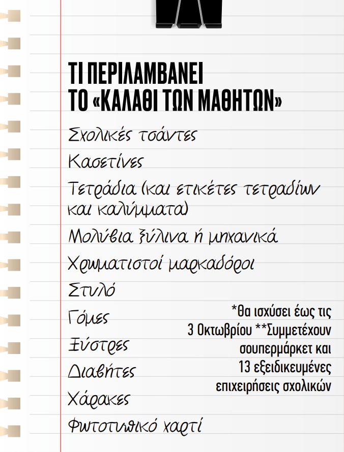 Από την άλλη, η – μικρότερη – «λίστα» για το Γυμνάσιο και το Λύκειο κοστίζει από 50 έως 70 ευρώ για κάθε μαθητή/τρια. Οι τιμές αυτές αντιστοιχούν κυρίως σε επώνυμα προϊόντα και μειώνονται ακόμη και στο μισό εάν επιλεγούν είδη ιδιωτικής ετικέτας. Πάντως και στις δύο περιπτώσεις στα ποσά αυτά δεν περιλαμβάνονται εκπαιδευτικά βιβλία – ελληνικά και ξενόγλωσσα – και βοηθήματα.