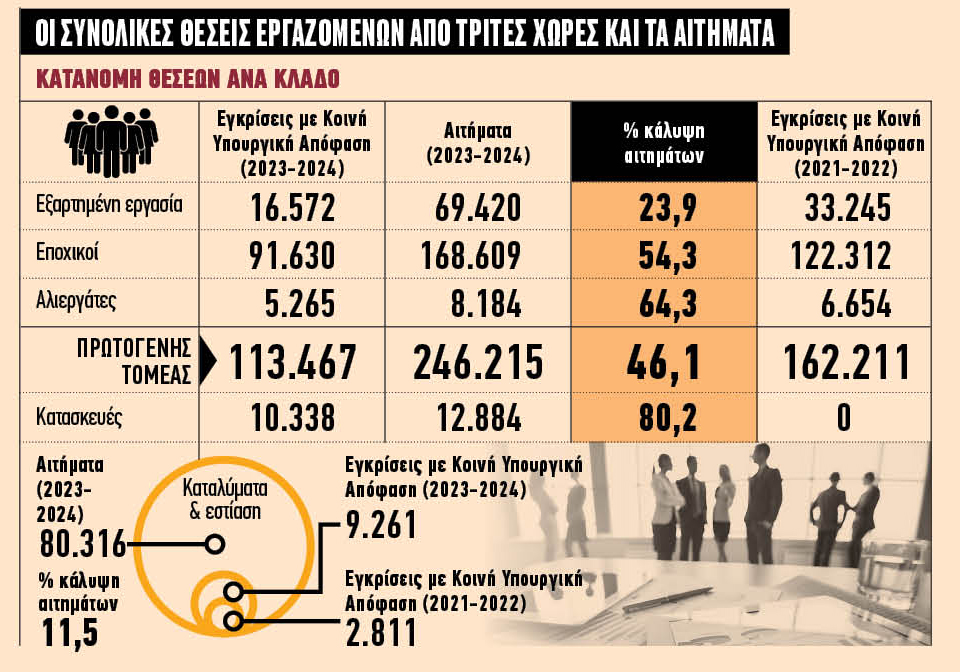 Συνολικά με την υπουργική απόφαση εγκρίθηκε η εισαγωγή 147.925 εργαζομένων από τρίτες χώρες, με τη συντριπτική πλειονότητα (113.467 εργαζομένων) να αφορά θέσεις εργασίας στον πρωτογενή τομέα. Επιπλέον 20.000 θέσεις θα καλυφθούν με διμερείς συμφωνίες με την Αίγυπτο και το Μπανγκλαντές.