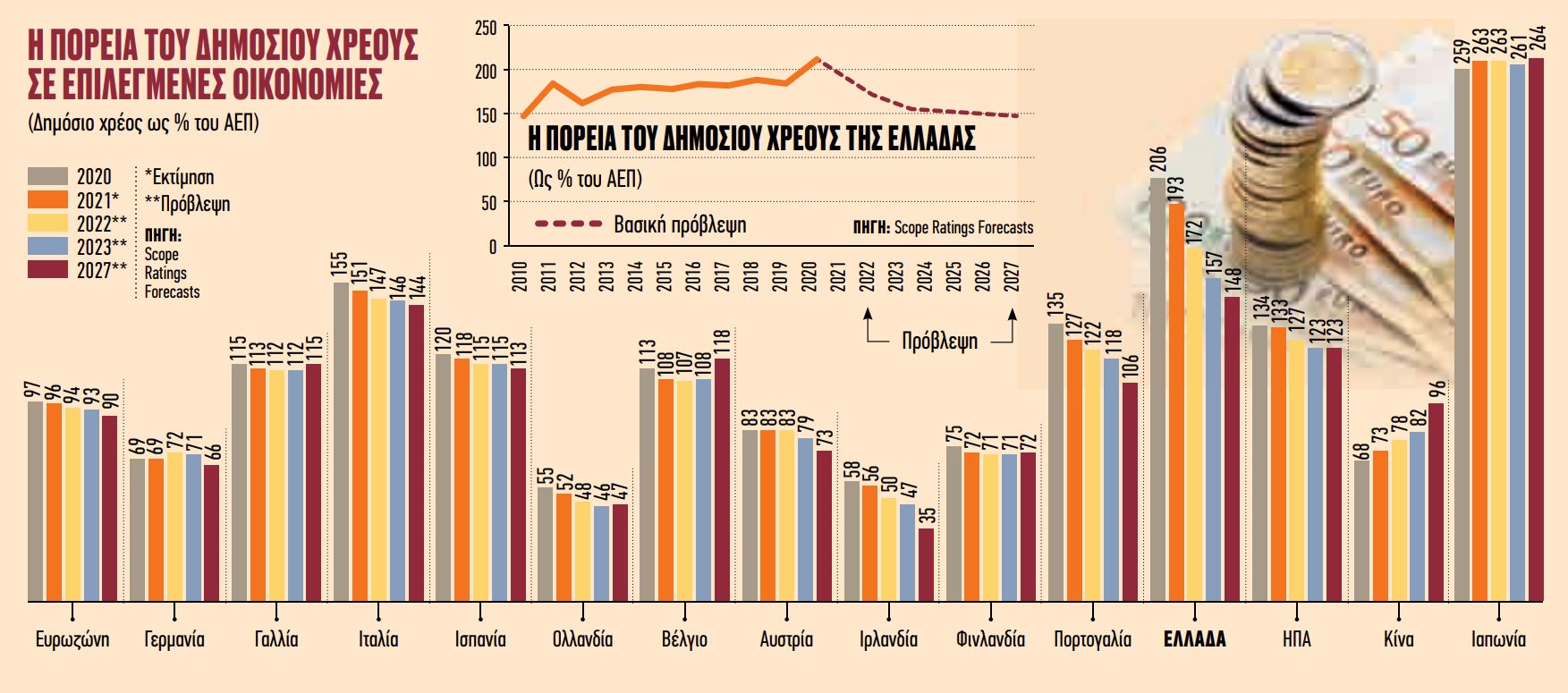 Είναι χαρακτηριστικό πως, σύμφωνα με τις εκτιμήσεις του γερμανικού οίκου αξιολόγησης Scope Ratings που πρόσφατα έγινε δεκτός για να αξιολογεί το χρέος που εκδίδει η Κομισιόν και έχει επίσης κάνει αίτηση στην ΕΚΤ για να αξιολογεί και το χρέος των χωρών-μελών (ως η ευρωπαϊκή απάντηση στους 4 μεγάλους οίκους) και ήταν ο πρώτος που έδωσε αξιολόγηση ένα σκαλοπάτι μακριά από την «επενδυτική βαθμίδα» για την Ελλάδα, το δημόσιο χρέος της χώρας μας θα μειωθεί ταχύτερα από ό,τι αναμενόταν, λόγω κυρίως του υψηλού πληθωρισμού αλλά και της υψηλότερης των δυνητικών ρυθμών ανάπτυξης και της δημοσιονομικής εξυγίανσης.