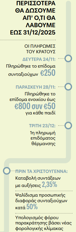 Αντιμέτωποι με μια σειρά φορολογικών και άλλων υποχρεώσεων που πρέπει να εκπληρωθούν έως το τέλος του έτους βρίσκονται εκατομμύρια πολίτες αλλά και επιχειρήσεις, ενώ την ίδια στιγμή ενοικιαστές και συνταξιούχοι είδαν μέσα στην εβδομάδα να κατατίθενται στον τραπεζικό λογαριασμό τους τα δύο πολυδιαφημισμένα επιδόματα.