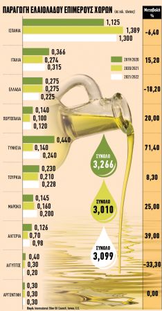 Η Ελλάδα, την περίοδο 2021-2022, με εκτιμώμενη παραγωγή 225.000 τόνους (-18,2% σε σύγκριση με την προηγούμενη περίοδο), κατατάσσεται στην 5η θέση παγκοσμίως (2η θέση το 2020), καθώς την 3η και 4η θέση καταλαμβάνουν αντίστοιχα η Τυνησία με παραγωγή 240.000 τόνους (αύξηση +71,4%) και η Τουρκία με παραγωγή που αναμένεται στους 228.000 τόνους (αύξηση +8,3%).