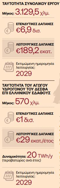 Σύμφωνα με τον ίδιο, το επενδυτικό κόστος (Capex) για το project «H2DRIA» έχει υπολογιστεί περίπου στο 1 δισ. ευρώ ενώ τα λειτουργικά του έξοδα (Opex) εκτιμώνται στα 26 εκατ. ευρώ ετησίως. Ο ορίζοντας ολοκλήρωσης του έργου προσδιορίζεται στο 2029, όπως και της επέκτασής του έως τη Γερμανία. Οσο για το μεγάλο project του αγωγού Ελλάδας – Γερμανίας των 3.129 χιλιομέτρων, το κόστος του υπολογίζεται στα 6,91 δισ. ευρώ και οι λειτουργικές του δαπάνες σε 189 εκατ. ευρώ ετησίως.