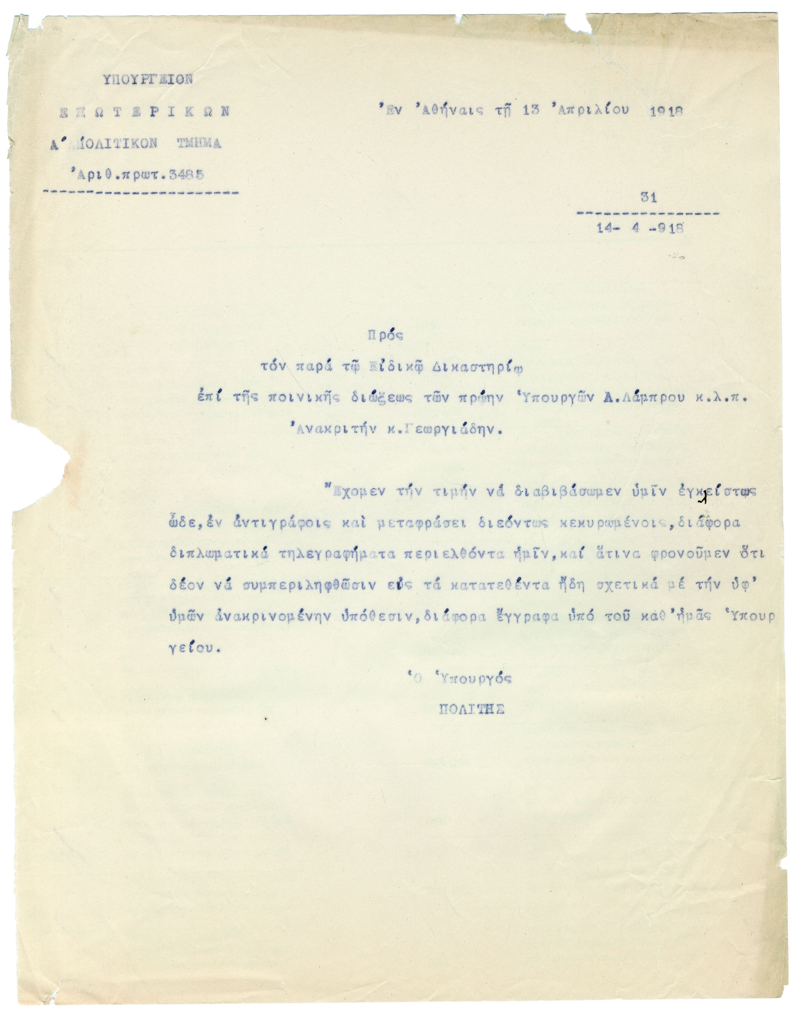Το έγγραφο του υπουργείου Εξωτερικών, που θέτει στη διάθεση του ανακριτή της υπόθεσης το διπλωματικό υλικό για τη στάση της Ελλάδας στον Α’ Παγκόσμιο Πόλεμο