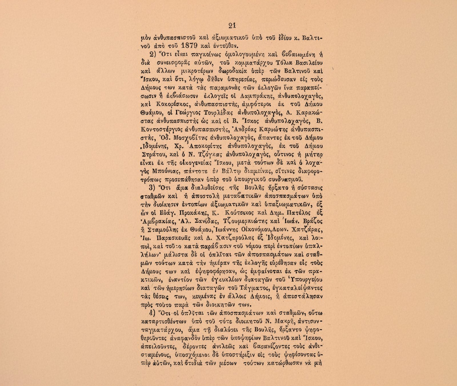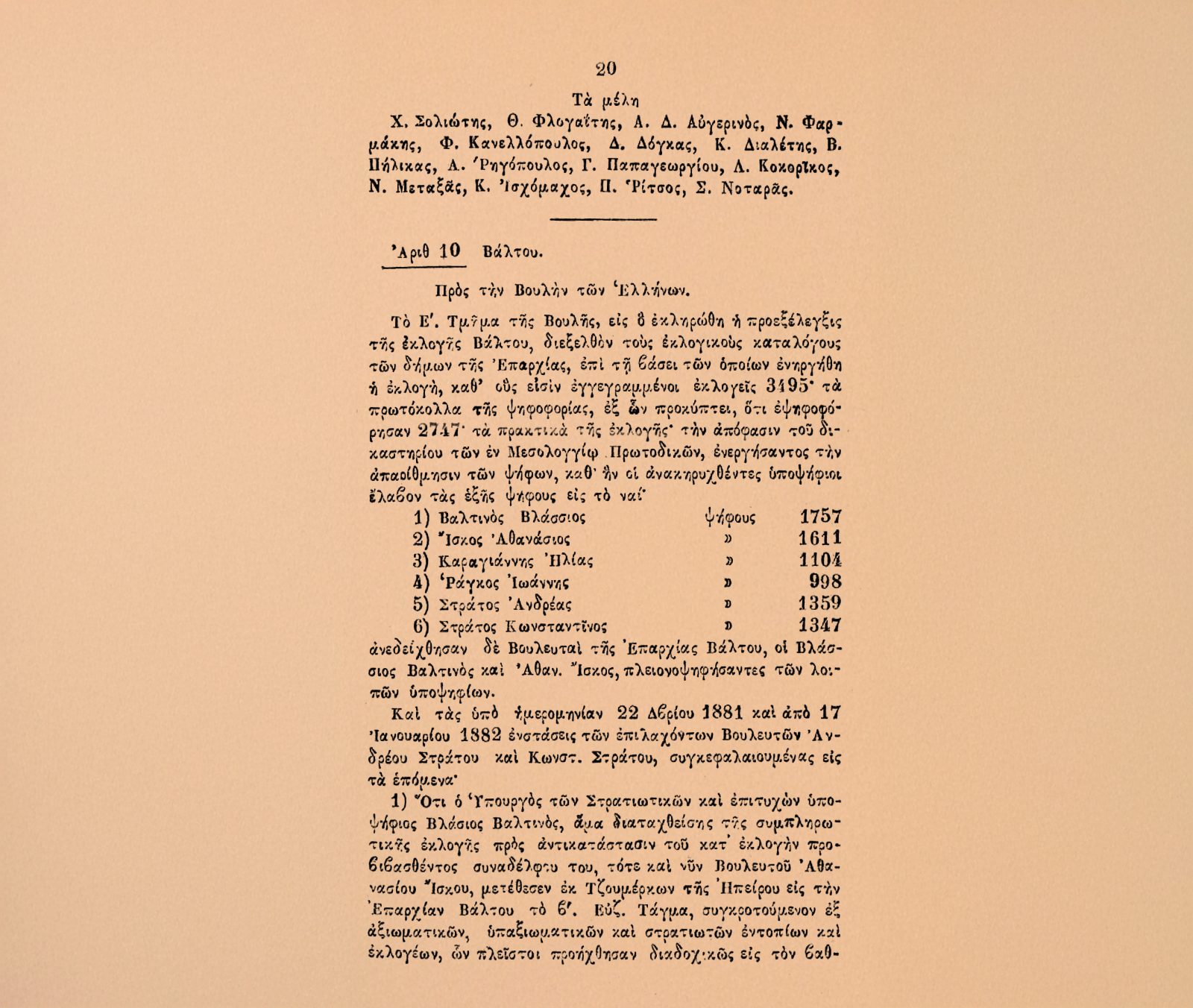 Υστερα απ’ όλα αυτά, το αρμόδιο Τμήμα της Βουλής «πείθεται, ότι η εκλογή της Επαρχίας Βάλτου ενηργήθη υπό το Κράτος κυβερνητικών επεμβάσεων και στρατιωτικής πιέσεως, μεταβληθέντων των αυτόθι τοποθετηθέντων επίτηδες στρατιωτικών εις εκλογικούς πράκτορας, προς βλάβην της αξιοπρεπείας του στρατού και του συμφέροντος της πολιτείας. Οτι η τοιαύτη νοθεία είναι η χειρίστη, αναμιμνήσκουσα θλιβερά προηγούμενα, των οποίων την επανάληψιν δεν ανέμενεν ο τόπος, και ότι εκ της νοθείας ταύτης μετεβλήθη το αποτέλεσμα της εκλογής υπέρ των επιτυχόντων Βαλτινού και Ισκου. Προτείνει δε εις την Βουλήν την ακύρωσιν της εκλογής ταύτης υπέρ του παραβιασθέντος εκλογικού νόμου, υπέρ της ελευθερίας των εκλογών και προς πρόληψιν εν τω μέλλοντι ασχημιών, αίτινες εκμηδενίζουσι το συνταγματικόν πολίτευμα και διαφθείρουσι τον στρατόν».