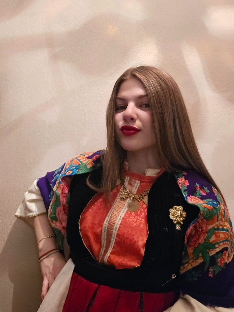 Η μαθήτρια Χριστιάννα Κωνσταντινίδου με την παραδοσιακή φορεσιά της προγιαγιάς της.