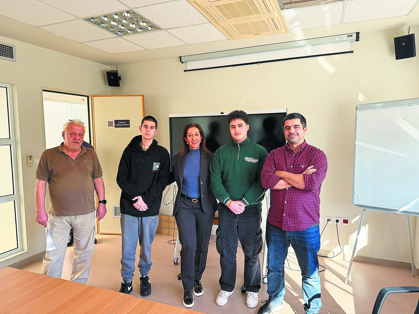 Από αριστερά: ο προϊστάμενος των υπηρεσιών γραμματείας του Πανεπιστημίου Δημήτρης Νικολάου, ο μαθητής Γ’ Λυκείου Νίκος Χουλιάρας, η εκπαιδευτικός Περιστέρα Σίμου, ο μαθητής Γ’ Λυκείου Γιάννης Σαρηπαπαζίδης και ο πρόεδρος του Τμήματος Οργάνωσης και Διοίκησης Επιχειρήσεων Γρηγόρης Γιανναράκης