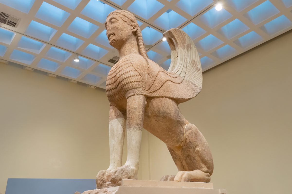 - Σφίγγα Ναξίων, Μουσείο Δελφών. Η Σφίγγα των Ναξίων ήταν ένα εντυπωσιακό ανάθημα στο ιερό του Απόλλωνα στους Δελφούς, τοποθετημένο πάνω σε ιωνικό κίονα ύψους 12,10 μέτρων. Χρονολογείται στον 6ο αιώνα π.Χ. και παριστάνει μυθική μορφή με σώμα λιονταριού, φτερά πτηνού και κεφάλι κόρης, διακοσμημένη με χαράξεις και χρώμα. Το αρχαϊκό χαμόγελό της και τα αμυγδαλωτά μάτια δίνουν ζωντάνια στην έκφραση. Στη βάση της χαράχθηκε ψήφισμα του 328-327 π.Χ. που παραχωρούσε στους Ναξίους το προνόμιο της προμαντείας στο Μαντείο των Δελφών.