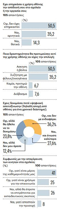 Στην ερώτηση, ποια δραστηριότητα θα μπορούσε να αντικαταστήσει την ενασχόλησή σας με την οθόνη, η σωματική άσκηση ήταν η δημοφιλέστερη απάντηση, ακολουθούμενη από τη συζήτηση με φίλους. Ιδιαίτερα ευχάριστο είναι πως το 40% έχει δοκιμάσει τη λεγόμενη «Ψηφιακή αποτοξίνωση». Η έρευνα ολοκληρώθηκε με την άποψη των ερωτηθέντων για την απαγόρευση των κινητών τηλεφώνων στις σχολικές εγκαταστάσεις. Με το αξιοσημείωτο ποσοστό του 66%, οι μαθητές εναντιώθηκαν στο μέτρο αυτό, ισχυριζόμενοι πως τα κινητά αποτελούν αναπόσπαστο κομμάτι της καθημερινότητάς τους.