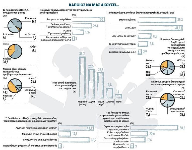 Ενα από τα πιο ενδιαφέροντα ευρήματα της έρευνας είναι το επικοινωνιακό χάσμα μεταξύ μαθητών και ενηλίκων. Πάνω από τους μισούς συμμετέχοντες θεωρούν ότι οι μεγαλύτεροι δεν κατανοούν πλήρως τους προβληματισμούς τους. Αυτό ενισχύει το αίσθημα απομόνωσης και κάνει πιο δύσκολη την έκφραση συναισθημάτων.Οσον αφορά τη διαχείριση του άγχους, οι μαθητές φαίνεται να στρέφονται κυρίως στους φίλους τους. Η φιλία λειτουργεί ως βασικός μηχανισμός υποστήριξης, ενώ λιγότεροι απευθύνονται σε εκπαιδευτικούς ή ειδικούς. Το στοιχείο αυτό δείχνει ότι αν και το σχολείο αποτελεί βασικό χώρο κοινωνικοποίησης, δεν αξιοποιείται πλήρως ως χώρος ψυχολογικής υποστήριξης.