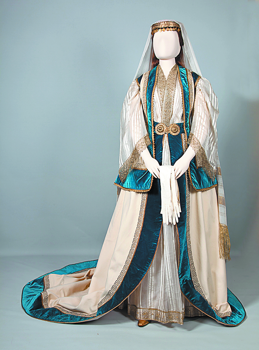 Ενδυμασία κυρίας επί των τιμών της βασίλισσας Όλγας, εμπνευσμένη από τη νυφική φορεσιά των Μεσογείων. Αθήνα. Μέσα 19ου αιώνα