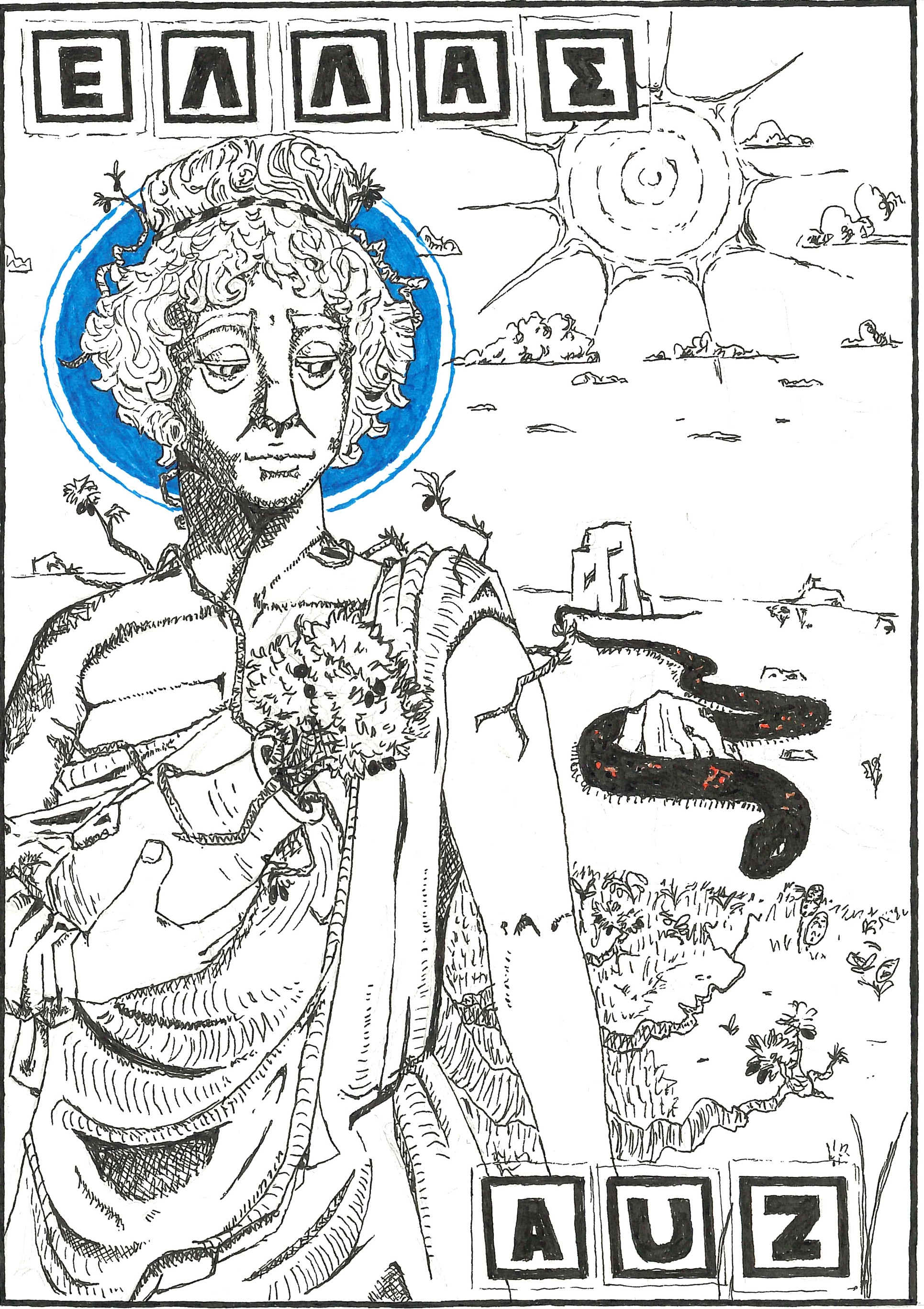Σκίτσο του μαθητή Κωνσταντίνου Σμυρνιώτη | Το σκίτσο επικεντρώνεται στο μεταφορικό «ρίζωμα» σε μια ξένη γη, κάτι που απεικονίζεται από την ελιά που φυτρώνει μέσα από τον αμφορέα, ένα φυτό που συνδέεται με τον ελληνικό πολιτισμό, και απλώνεται καλύπτοντας τόσο το μαρμάρινο άγαλμα όσο και το έδαφος. Αυτό συμβολίζει την εμπειρία ενός μετανάστη να κάνει μια ξένη γη το νέο του σπίτι, δημιουργώντας συνδέσεις και σχέσεις που τον δένουν με τη γη. Η παρουσία τόσο του ελληνικού αγάλματος όσο και του φιδιού του ουράνιου τόξου (μυθολογικό ον για τους Αβορίγινες Αυστραλούς) συμβολίζει το πώς η παρουσία του ενός πολιτισμού δεν μειώνει τον άλλον, καθώς και οι δύο μπορούν να συνυπάρχουν αρμονικά.