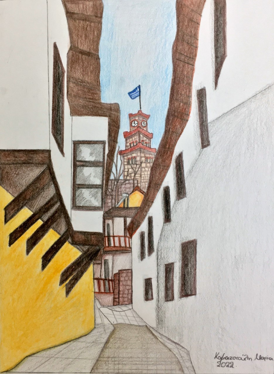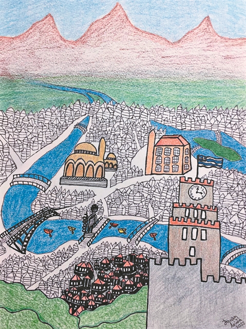 Σκίτσο της μαθήτριας Δανάης Λούδα, που απεικονίζει την πόλη των Τρικάλων με τα σημαντικότερα μνημεία της.