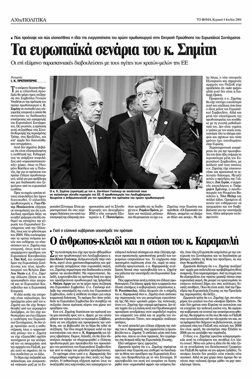 Λίγους μήνες μετά την παραίτησή του από την προεδρία του ΠαΣοΚ και τη λήξη της πρωθυπουργικής του θητείας, ο Κώστας Σημίτης, με τη σύμφωνη γνώμη της κυβέρνησης Κώστα Καραμανλή, καταθέτει στην Ευρωπαϊκή Ενωση πρόταση σύστασης επιτροπής για τον συντονισμό των διαδικασιών επικύρωσης και εφαρμογής του Ευρωπαϊκού Συντάγματος. Αν και τα αισιόδοξα σενάρια ήθελαν τη δημιουργία μιας τέτοιας επιτροπής υπό τον Κώστα Σημίτη να γίνεται πραγματικότητα, εν τέλει η πρόταση απορρίφθηκε