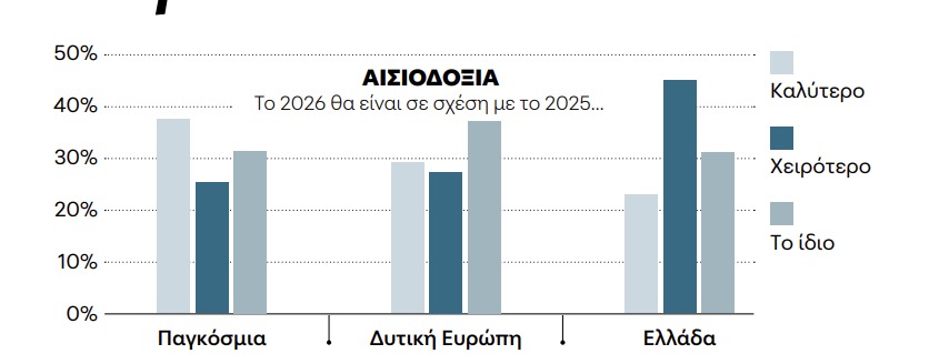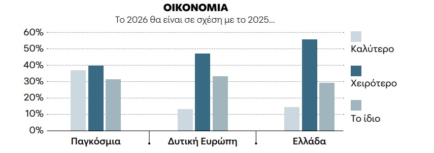 Στην Ελλάδα, η εικόνα είναι ακόμη πιο επιβαρυμένη. Μόλις το 14% των ερωτηθέντων πιστεύει ότι το 2026 θα είναι οικονομικά καλύτερο, ενώ το 56% αναμένει επιδείνωση. Παρά τη σχετική μακροοικονομική σταθεροποίηση και τους θετικούς δείκτες ανάπτυξης των τελευταίων ετών, η κοινωνική αντίληψη παραμένει εύθραυστη. Το υψηλό κόστος διαβίωσης, η εργασιακή ανασφάλεια και η αίσθηση ότι οι διεθνείς εξελίξεις μπορούν να ανατρέψουν εύκολα τις ισορροπίες διαμορφώνουν ένα κλίμα έντονης επιφυλακτικότητας.