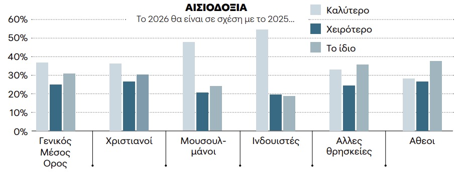 Ενδιαφέρον παρουσιάζει η ανάλυση των απαντήσεων με βάση τη θρησκεία των ερωτώμενων. Οι Χριστιανοί κινούνται ουσιαστικά στον γενικό μέσο όρο, χωρίς αξιοσημείωτες αποκλίσεις. Αντίθετα, οι Μουσουλμάνοι και οι Ινδουιστές εμφανίζονται πιο αισιόδοξοι, ενώ οι άθεοι ξεχωρίζουν για την πιο απαισιόδοξη στάση τους.