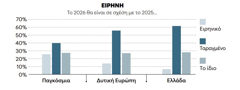 Η μεγαλύτερη ανησυχία, ωστόσο, αφορά την παγκόσμια ειρήνη. Σε διεθνές επίπεδο, μόλις το 24% πιστεύει ότι το 2026 θα είναι πιο ειρηνικό από το 2025, ενώ το 40% προβλέπει περισσότερες συγκρούσεις και αναταραχές. Και εδώ η Δυτική Ευρώπη εμφανίζεται η πιο απαισιόδοξη περιοχή: μόνο το 14% αναμένει βελτίωση, ενώ η πλειοψηφία φοβάται κλιμάκωση της αστάθειας.