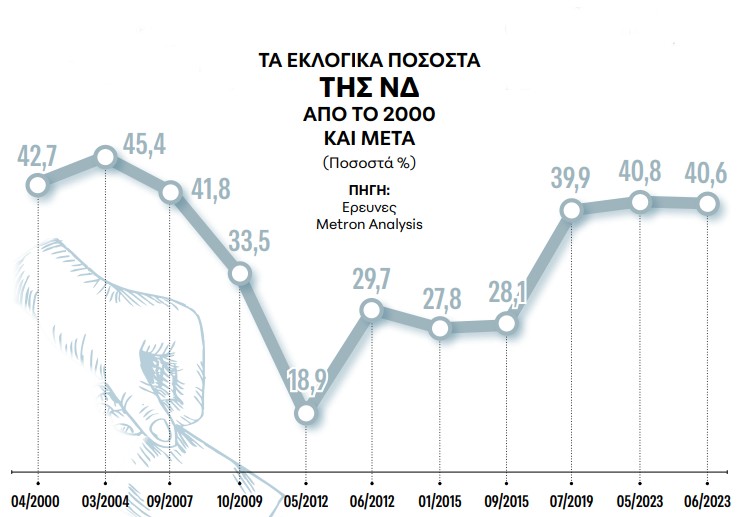 Το ΠαΣοΚ, έχοντας ήδη πολλά χρόνια στην κυβέρνηση, έδινε την αίσθηση κουρασμένου κόμματος – αίσθηση που συνοδευόταν και από μια διάχυτη οσμή σκανδάλων. Ετσι, η ΝΔ, που ιστορικά διεκδικούσε τον ρόλο του πιο σταθερού πυλώνα του κομματικού μας συστήματος, φάνηκε ήδη από το 2000 ότι βρισκόταν στα πρόθυρα της εξουσίας και πως ήταν ζήτημα χρόνου να την καταλάβει. Πράγματι, τον Μάρτιο του 2004 η ΝΔ του Κ. Καραμανλή κέρδιζε τις εκλογές με 45,4%.