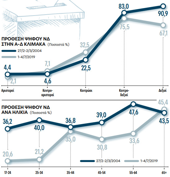 Το 2004 η πρόθεση ψήφου στη ΝΔ πριν από τις εκλογές παρουσίαζε μια σημαντική ηλικιακή ομοιογένεια, που κινούνταν από 36,2% στις ηλικίες 17-24 ετών μέχρι 47,6% στις ηλικίες 55-64, δηλαδή σε ένα εύρος περί τις 10 μονάδες. Το 2019, οι αποστάσεις γίνονται χάσμα: 20,6% στους 17-24 αλλά 45,4% στους 65+, όπου και το ισχυρότερο ποσοστό για τη ΝΔ. Η κεντρώα μετατόπιση της ΝΔ συμβαδίζει, λοιπόν, με ένα δημογραφικό προφίλ που προσιδιάζει σε εκείνο της χώρας: αδυναμία στις νεότερες ηλικίες και υπερεκπροσώπηση στις (αρκετά) μεγαλύτερες, που όμως είναι και εκείνες που εν τέλει ψηφίζουν.