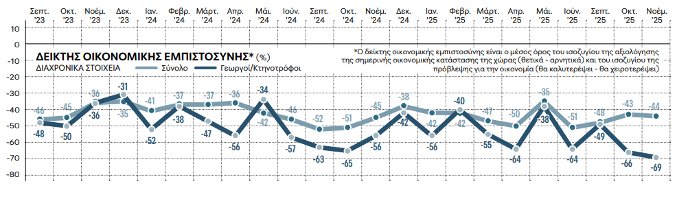 Τουλάχιστον για τα τελευταία δύο έτη, η πορεία του δείκτη στο σύνολο των ερωτώμενων κινείται μεν σε αρνητικές τιμές, αλλά χωρίς μεγάλες διακυμάνσεις, σε επίπεδα περί το -40/-45. Ειδικά όμως στους γεωργούς/κτηνοτρόφους, ο δείκτης κινείται κατά κανόνα χαμηλότερα ή και αρκετά χαμηλότερα, σε επίπεδα που φτάνουν και κάτω από το -60 και μάλιστα με πτωτική τάση· είναι δε χαρακτηριστικό ότι από τον Απρίλιο, στις τέσσερις από τις έξι μετρήσεις, έχει πέσει στα επίπεδα του -64 έως -69 (τον Νοέμβριο).