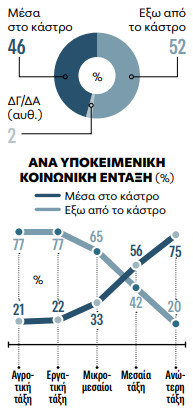 Εδώ διακρίνεται όμως ένα σταθερό και σαφές κοινωνικό μοτίβο. Όπως φαίνεται ενδεικτικά στη μέτρηση του Νοεμβρίου, όσοι τοποθετούν τον εαυτό τους στην ανώτερη τάξη απαντούν ότι αισθάνονται εντός των τειχών σε ποσοστό 75%, ενώ αντίθετα όσοι αυτοτοποθετούνται στην εργατική και στην αγροτική τάξη δηλώνουν κατά 77% ότι νιώθουν εκτός. Για την αγροτική τάξη, αυτή η αίσθηση μπορεί να έχει την έννοια της αντιλαμβανόμενης απόστασης από το «κέντρο» της χώρας – όχι μόνο γεωγραφικά, αλλά και οικονομικά και πολιτικά. Ταυτόχρονα, όμως, τα στρώματα αυτά δηλώνουν «outsiders», απροστάτευτα απέναντι στις υλικές και συμβολικές επισφάλειες που στην εποχή μας πληθαίνουν.