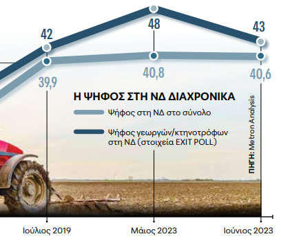 Αν συγκρίνουμε τα στοιχεία των exit polls με τα αποτελέσματα των εθνικών εκλογών, για παράδειγμα από τον «διπλό εκλογικό σεισμό» του 2012, έως τις εκλογές του 2023, που έδωσαν στη ΝΔ τη δεύτερη κυβερνητική θητεία, παρατηρούμε ότι τα ποσοστά της ΝΔ στους γεωργούς/κτηνοτρόφους είναι σταθερά υψηλότερα απ’ ό,τι οι επιδόσεις της σε εθνικό επίπεδο. Ακόμη και όταν η ΝΔ βρέθηκε σε ιστορικά χαμηλά επίπεδα, στις εκλογές του Μαΐου 2012 (18,9%), τα αγροτικά στρώματα της έδιναν πάνω από 30%, ενώ τον Μάιο του 2023 σχεδόν 1 στους 2 αγρότες φαίνεται να ψήφισε ΝΔ.