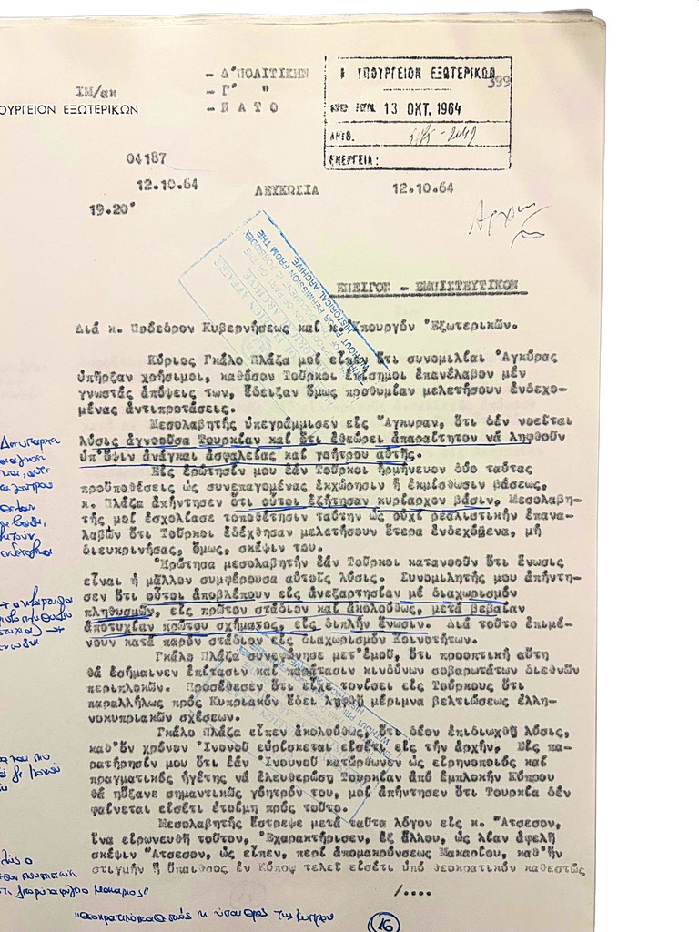 Εμπιστευτικό έγγραφο του πρέσβη της Ελλάδας στην Κύπρο Μενέλαου Αλεξανδράκη προς το υπουργείο Εξωτερικών, με αποδέκτες τον πρωθυπουργό Γεώργιο Παπανδρέου και τον υπουργό Εξωτερικών Σταύρο Κωστόπουλο, με ημερομηνία 12 Οκτωβρίου 1964. Ο Αλεξανδράκης περιγράφει τα βασικά σημεία που αποκόμισε από τις επαφές του με τον τότε διαμεσολαβητή του ΟΗΕ για το Κυπριακό Γκάλο Πλάζα. Σύμφωνα με τον Πλάζα, η Τουρκία δεν πρόκειται να αποδεχθεί λύση χωρίς να ληφθούν υπόψη «οι ανάγκες της» στον τομέα της ασφάλειας, αλλά και το «γόητρό» της. Ο διαμεσολαβητής λέει στον Αλεξανδράκη ότι πρώτος στόχος των Τούρκων είναι ο διαχωρισμός των πληθυσμών και κατόπιν η «διπλή ένωση» (διχοτόμηση με παράλληλη ένωση του ελληνοκυπριακού τμήματος με την Ελλάδα).
