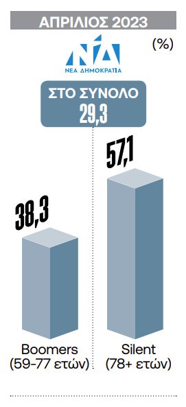 Κατά την πρώτη παρατήρηση των ερευνών, οι οποίες συμπεριέλαβαν και τα ζητήματα στα οποία προσφάτως δοκιμάστηκε η κυβέρνηση, με κυριότερο τον γάμο των ομοφύλων και την πολιτική του διαχείριση, έμπειροι αναλυτές επιβεβαιώνουν μια γενική αίσθηση, η οποία διαπιστώνεται σε στενότερο ή ευρύτερο κοινωνικό πεδίο: ότι οι ψηφοφόροι μεγαλύτερων ηλικιακών ομάδων (γενιές τα μέλη των οποίων έχουν κατηγοριοποιηθεί ως boomers για τις ηλικίες 60 έως 80 ετών και silents για τους άνω των 80 ετών), στις οποίες υπερίσχυσε κατά κράτος η ΝΔ στις τελευταίες εκλογικές αναμετρήσεις, εμφανίζουν τάσεις αποστασιοποίησης, η οποία μετριέται στις έρευνες των ημερών, των οποίων τα αποτελέσματα αναμένεται να δημοσιοποιηθούν σύντομα. Το στοιχείο αυτό ερμηνεύεται εκ των πραγμάτων και από μία άλλη παράμετρο.
