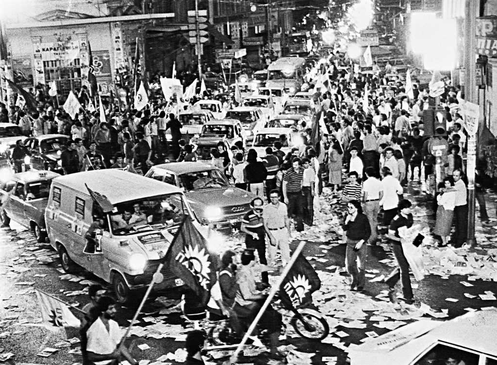 Οπαδοί του ΠαΣοΚ πανηγυρίζουν μετά τη νίκη του κόμματος στις εκλογές του 1985.