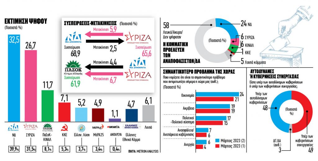 Κλείνοντας, θα θέλαμε να επισημάνουμε ότι ο πρωθυπουργός κ. Μητσοτάκης σημείωσε αμέσως μετά τα Τέμπη μία σημαντική πτώση στις αυθόρμητες αναφορές ως καταλληλότερος για πρωθυπουργός, της τάξεως των 7 ποσοστιαίων μονάδων, και πολύ γρήγορα (μέσα σε δεκαπέντε ημέρες) ανέκτησε τις 4 από αυτές. Η εξέλιξη αυτή οφείλεται κατά τη γνώμη μας στο ότι η συζήτηση περί του πιθανού προσώπου του επόμενου πρωθυπουργού, με τον τρόπο που διεξήχθη κατά τις ημέρες της διεξαγωγής της έρευνας πεδίου, σαφώς τον ευνοεί γιατί τον προβάλλει ως τη μόνη «ρεαλιστική» επιλογή. Εχουμε τονίσει και στο παρελθόν ότι το εκλογικό σώμα είναι διχοτομημένο ανάμεσα στην προτίμηση αυτοδύναμων κυβερνήσεων (48%) και των κυβερνήσεων συνεργασίας (49%). Και επειδή ο μόνος που διεκδικεί ευθαρσώς και ρεαλιστικά την αυτοδυναμία είναι ο κ. Μητσοτάκης, κυριαρχεί στο μισό εκλογικό σώμα που προτιμά αυτοδυναμία με πρόθεση ψήφου 44,9%, ενώ ο χώρος των κυβερνήσεων συνεργασίας είναι κατακερματισμένος με κυρίαρχη δύναμη τον ΣΥΡΙΖΑ (πρόθεση ψήφου 29,9%) αλλά και ασάφεια ως προς τις δυνατές συνεργασίες.