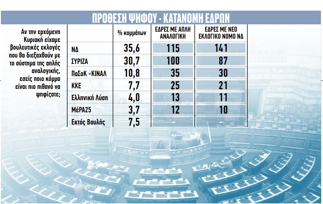 Με βάση, λοιπόν τα τελευταία δεδομένα της GPO και κάνοντας την κατανομή των εδρών με προβολή των δημοσκοπικών ποσοστών στα έγκυρα, με την απλή αναλογική η ΝΔ συγκεντρώνει 115 έδρες, ο ΣΥΡΙΖΑ 100, το ΠαΣοΚ 35, το ΚΚΕ 25, η Ελληνική Λύση 13 και το ΜέΡΑ25 12 έδρες. Στο συγκεκριμένο σενάριο το ποσοστό της μη αντιπροσωπευόμενης ψήφου, των κομμάτων, δηλαδή, που μένουν εκτός Βουλής, ανέρχεται στο 7,5%. Εδώ βέβαια υπεισέρχεται μια σειρά αστάθμητων παραγόντων που σχετίζονται με το ύψος της συμμετοχής στην επερχόμενη εκλογική διαδικασία, την πιθανή αντισυστημική έκφραση του εκλογικού σώματος, ως απάντηση στο συνολικό έλλειμμα εμπιστοσύνης απέναντι στο πολιτικό σύστημα και τη συμπεριφορά των αναποφάσιστων ψηφοφόρων, η δεξαμενή των οποίων έχει αυξηθεί σημαντικά μετά τα Τέμπη.