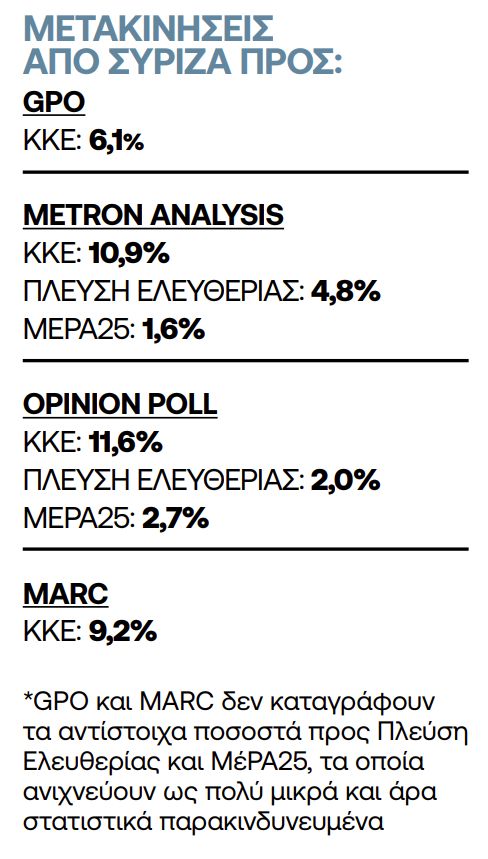 Από τις πρώτες δημοσκοπήσεις όταν «άρχισαν τα όργανα» στον ΣΥΡΙΖΑ, το ΚΚΕ εμφανιζόταν να απορροφά τη μερίδα του λέοντος των δυσαρεστημένων ψηφοφόρων του ΣΥΡΙΖΑ (η Metron Analysis έδειχνε τον Οκτώβριο να μετακινείται προς το ΚΚΕ το 7,8% σε σύγκριση με το 6,5% προς το ΠαΣοΚ), ενώ και οι μεταγενέστερες έρευνες εμφανίζουν το ΚΚΕ να έχει την ίδια εισροή με το ΠαΣοΚ ή μικρότερη αλλά καθόλου αμελητέα (η GPO προσφάτως κατέγραφε μετακινήσεις 8,1% προς το ΠαΣοΚ και 6,1% προς το ΚΚΕ).