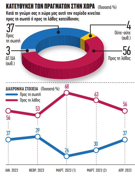 Δεν έχουν περάσει ακόμα δύο μήνες από την τραγωδία των Τεμπών και το κλίμα του εθνικού πένθους και της θλίψης δείχνει, στη μεταπασχαλινή περίοδο, σημάδια αποφόρτισης. Η θετική εκτίμηση για την πορεία της χώρας βελτιώνεται και κινείται τώρα στο 37% από το 26% των ημερών της τραγωδίας.