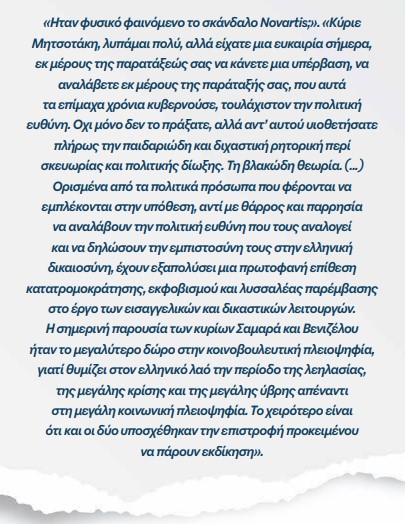 «Εκ των υστέρων, δεν έχω κανένα πρόβλημα να αναγνωρίσω ότι έκανα λάθος. Δεν εκτίμησα όλες τις παραμέτρους της απόφασης αυτής. Μπορεί στον πυρήνα της, που ήταν να αποφασίσει ο φυσικός δικαστής, να είχε τις καλύτερες θεσμικές και πολιτικές προθέσεις, στην πράξη όμως έδωσε την εντύπωση πως στιγματίσαμε και τους έντεκα πολιτικούς. Πολύ περισσότερο που, πρακτικά, για να εφαρμοστεί, έπρεπε να αποφασίσουμε την παραπομπή, έστω και για μια ημέρα, και των έντεκα στην Προανακριτική Επιτροπή. Δεν κάναμε την κρίσιμη διάκριση που έπρεπε να κάνουμε και που απαιτούσε πολιτικό θάρρος και καθαρή ματιά: Να οργανώσουμε, μέσω της Προανακριτικής Επιτροπής, μια ουσιαστική κοινοβουλευτική έρευνα, να εξετάσουμε τα δεδομένα σε βάθος και να καταλήξουμε σε τεκμηριωμένα πορίσματα. Αντί για στοχευμένη και προσεκτική απόδοση ευθυνών, δώσαμε την εντύπωση πως επιλέγουμε μια μαζική παραπομπή. Και αυτό, δυστυχώς, είχε κόστος, θεσμικό, πολιτικό και ηθικό… Στο τέλος λειτούργησε σε βάρος μας και προς όφελος όσων ήθελαν να παρουσιάσουν την υπόθεση ως πολιτική σκευωρία». (σελ. 442-443)