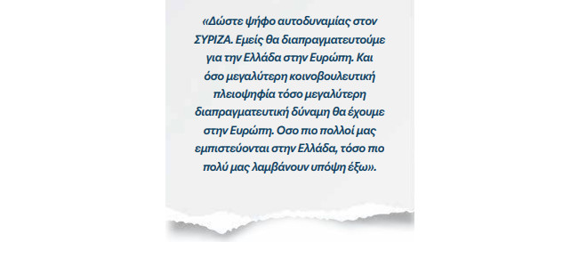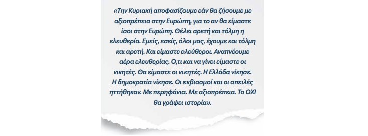 «Ημουν ξεκάθαρος: με κανέναν τρόπο δεν έπρεπε να επιτρέψουμε να γλιστρήσει η συζήτηση στο έδαφος που ήθελαν οι εταίροι μας, να μετατραπεί, δηλαδή, το δημοψήφισμα σε δίλημμα “ευρώ ή δραχμή”. Το ερώτημα για εμάς δεν ήταν η παραμονή ή η έξοδος από την ευρωζώνη». (σελ. 260)