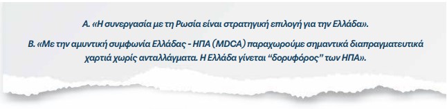 Β. «Κατά την περίοδο 2017-2019 προώθησα, με την κινητοποίηση του Νίκου Κοτζιά και του Βαγγέλη Καλπαδάκη, την ουσιαστική αναβάθμιση της στρατηγικής συνεργασίας με τις ΗΠΑ… Δικαιολογημένη ήταν και η στάση της δικής μου γενιάς, που ωρίμασε πολιτικά στη μεταψυχροπολεμική περίοδο και αντιτάχθηκε στις ”ανθρωπιστικές επεμβάσεις” των ΗΠΑ και ειδικά στον πόλεμο στο Ιράκ, όπως αντιτάχθηκε και στη νεοφιλελεύθερη παγκοσμιοποίηση. Ως Πρωθυπουργός όμως εκπροσωπούσα την πατρίδα μου και όχι την παράταξη ή τον εαυτό μου. Οφειλα να αξιοποιήσω κάθε ευκαιρία για αναβάθμιση των συμμαχιών και συνεργασιών της Ελλάδας, ειδικά με τις ΗΠΑ. Αυτό έκανα απολύτως συνειδητά και πάντα επιδιώκοντας κάθε βήμα στις ελληνοαμερικανικές σχέσεις να γίνεται σε αμοιβαία επωφελή βάση και στο πλαίσιο μιας ευρύτερης, πολυδιάστατης εξωτερικής πολιτικής προς όλες τις κατευθύνσεις». (σελ. 699)