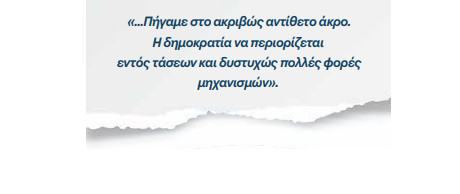 «…Υπήρξε ένα έλλειμμα πολιτικής εγρήγορσης από τη μεριά μου. Επρεπε να είχα αντιληφθεί τη σημασία και την αναγκαιότητα μιας πιο καθαρής, πιο αποφασιστικής στάσης. Οχι για να καταστείλω την κριτική ή τη διαφορετική άποψη, αλλά για να ανοίξω μέτωπο, καθαρά, χωρίς συμψηφισμούς και μισόλογα, με φαινόμενα που απομάκρυναν κόσμο από το κόμμα και το κόμμα από την κοινωνία. Να συγκρουστώ ανοιχτά με λογικές που ήθελαν στην ουσία ένα κόμμα περίκλειστο, φοβικό, καθηλωμένο σε μηχανισμούς και παραλυτικές ισορροπίες. Και να καταστήσω σαφές ότι ο πλουραλισμός των ιδεών, συστατικό στοιχείο της κουλτούρας της Αριστεράς, μέσω της σύγκρουσης τάσεων εκφυλίστηκε και καλλιέργησε δομές μικροεξουσιών που αποδείχθηκαν ιδιαίτερα παραλυτικές». (σελ. 576)