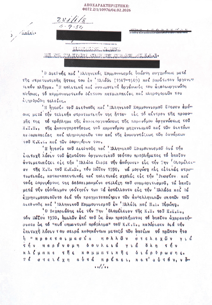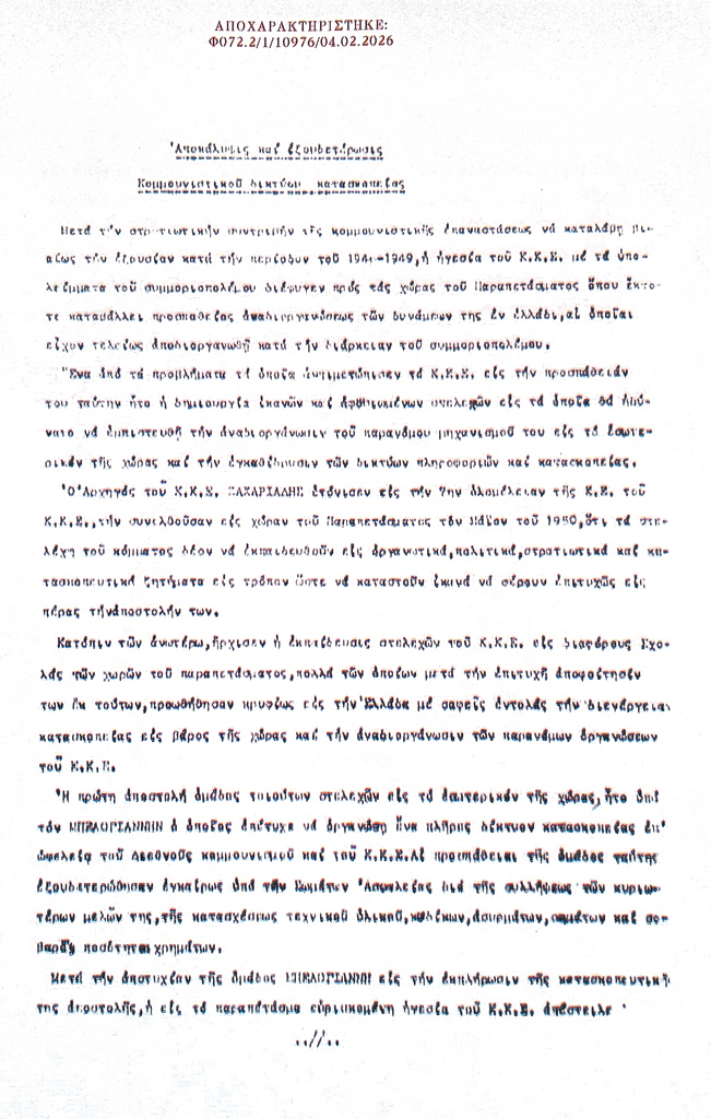 «Μετά την στρατιωτικήν συντριβήν της κομμουνιστικής επαναστάσεως να καταλάβη βιαίως την εξουσίαν κατά την περίοδον του 1946-1949, η ηγεσία του ΚΚΕ με τα υπολείμματα του συμμοριοπολέμου διέφυγεν προς τας χώρας του Παραπετάσματος όπου έκτοτε καταβάλλει προσπαθείας αναδιοργανώσεως των δυνάμεών της εν Ελλάδι» αναφέρουν οι ΚΥΠατζίδες σημειώνοντας πως «ένα από τα προβλήματα τα οποία αντιμετώπισεν το ΚΚΕ εις την προσπάθειάν του ταύτην ήτο η δημιουργία ικανών και αφοσιωμένων στελεχών εις τα οποία θα ηδύνατο να εμπιστευθή την αναδιοργάνωσιν του παράνομου μηχανισμού του εις το εσωτερικόν της χώρας και την εγκαθίδρυσιν των δικτύων πληροφοριών και κατασκοπείας».