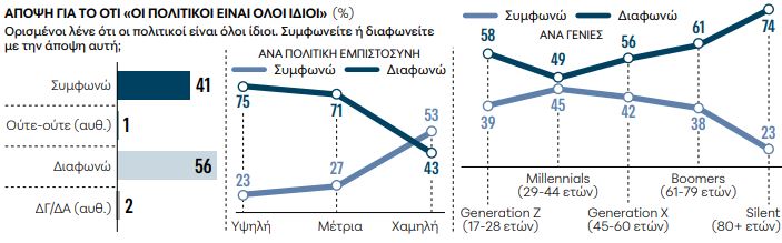 Ας δούμε τώρα και κάτι λιγότερο αισιόδοξο. Ακούγεται – και λέγεται – συχνά ότι «όλοι οι πολιτικοί ίδιοι είναι». Στην έρευνά μας προκύπτει ότι ναι μεν η πλειονότητα των ερωτώμενων διαφωνεί (56%), υπάρχει όμως ένα όχι ευκαταφρόνητο 41% που συμφωνεί με αυτό το μάλλον ισοπεδωτικό κλισέ – και πιο έντονα όσοι απορρίπτουν την κλασική διάκριση Αριστερά-Δεξιά και αρνούνται να τοποθετηθούν σε αυτό το φάσμα (53%). Εδώ, έχουν ιδιαίτερη σημασία δύο διαστάσεις.