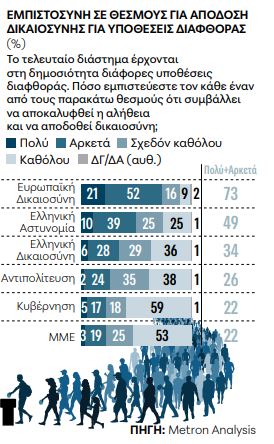 Από τους «εντός χώρας» θεσμούς ξεχωρίζει η ΕΛ.ΑΣ. με 49% και έπεται σε απόσταση η ελληνική Δικαιοσύνη με 34% (αν και 65% δηλώνουν ότι δεν την εμπιστεύονται Σχεδόν Καθόλου/Καθόλου). Σε ακόμη χαμηλότερες θέσεις βρίσκονται οι πολιτικοί θεσμοί: η Αντιπολίτευση με 26%, και η Κυβέρνηση με 22% (αλλά και με 77% που δεν την εμπιστεύονται Σχεδόν Καθόλου/Καθόλου), μαζί με τα ΜΜΕ.