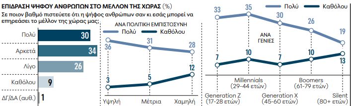 Ας ξεκινήσουμε με ένα αισιόδοξο εύρημα. Η πλειονότητα των ερωτώμενων πιστεύει ότι η ψήφος τους, η κατεξοχήν δημοκρατική διαδικασία, δεν είναι άνευ ουσίας αλλά μπορεί πράγματι να επηρεάσει το μέλλον της χώρας: 30% και 34% πιστεύουν αντίστοιχα ότι μπορεί να επηρεάσει Πολύ και Αρκετά, ενώ μόνο 9% δεν το πιστεύει καθόλου. Μάλιστα, είναι χαρακτηριστικό ότι οι νεότερες γενιές είναι περισσότερο πεπεισμένες: η Gen Z κατά 33% και οι Millennials κατά 35% πιστεύουν ότι η ψήφος τους μετράει πολύ.