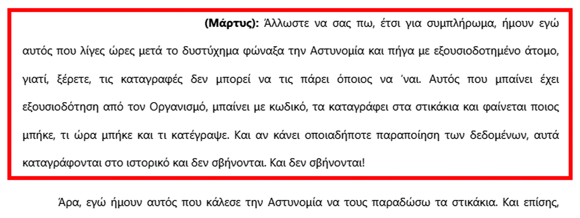 Συμπληρώνεται ότι η εφημερίδα μας επικοινώνησε με το στέλεχος του ΟΣΕ που αναφέρθηκε σε άμεση, μετά το δυστύχημα, επίσκεψη με αστυνομικούς στον χώρο διατήρησης των ηχογραφημένων συνομιλιών. Ο ίδιος υποστηρίζει πλέον ότι τελικά η επίσκεψή του υπήρξε στις 3 Μαρτίου 2023, ωστόσο κράτησε και ο ίδιος ψηφιακό αντίγραφο γιατί εκτιμούσε ότι θα ζητηθεί από δικαστικούς λειτουργούς, πέρα δηλαδή από την επίσημη διαδικασία.
