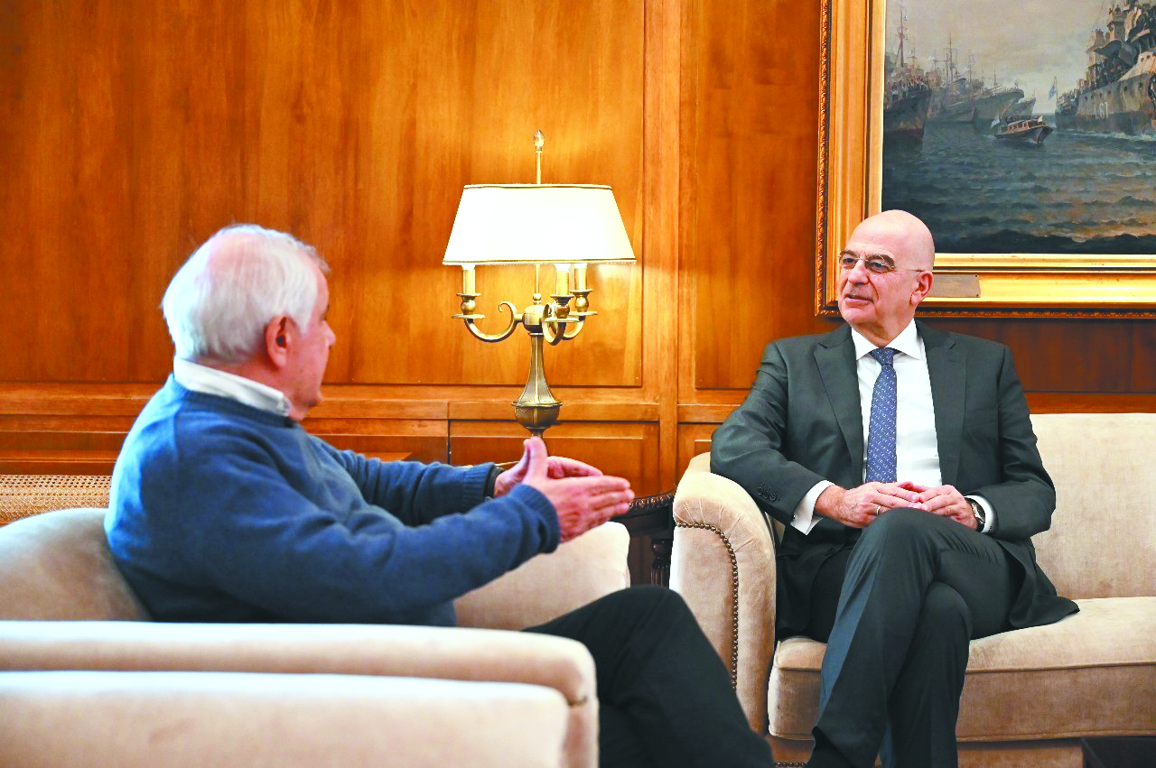 Ο Νίκος Δένδιας συζητεί με τον συντάκτη του «Βήματος» Νίκο Χασαπόπουλο