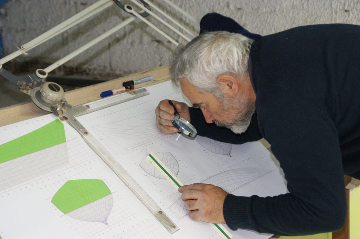 Η αρχή της ναυπήγησης ξεκινά από τη μεταφορά των διαστάσεων από το σχέδιο των ναυπηγικών γραμμών στο «πινακάκι» για τον σχεδιασμό σε φυσικό μέγεθος στη «σάλα». Ο Ν. Βλαβιανός επί το έργον.