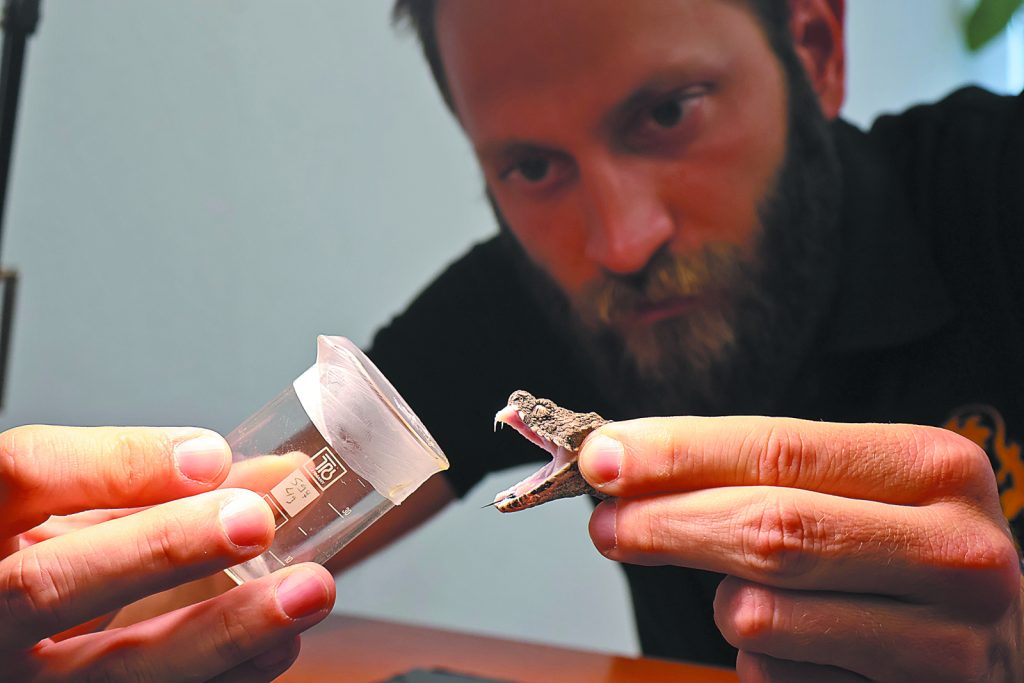 Ο κ. Θωμάς Δάφτσιος εξάγει στο εργαστήριο δηλητήριο από μια οχιά της Μήλου